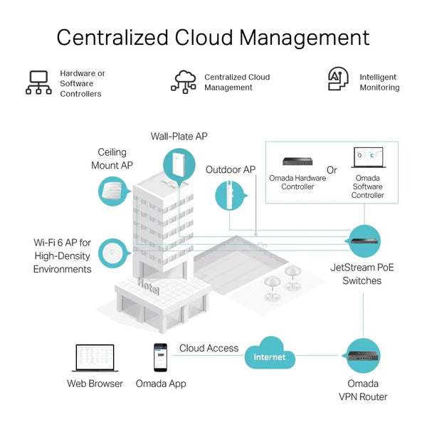 Centralized Cloud Management: Integrated into the Omada Software Defined Networking (SDN) platform, the router offers centralized cloud management and intelligent monitoring. This allows for remote management and configuration via the Omada app, providing convenience and ease of use for network administrators, enabling them to manage the network from anywhere.